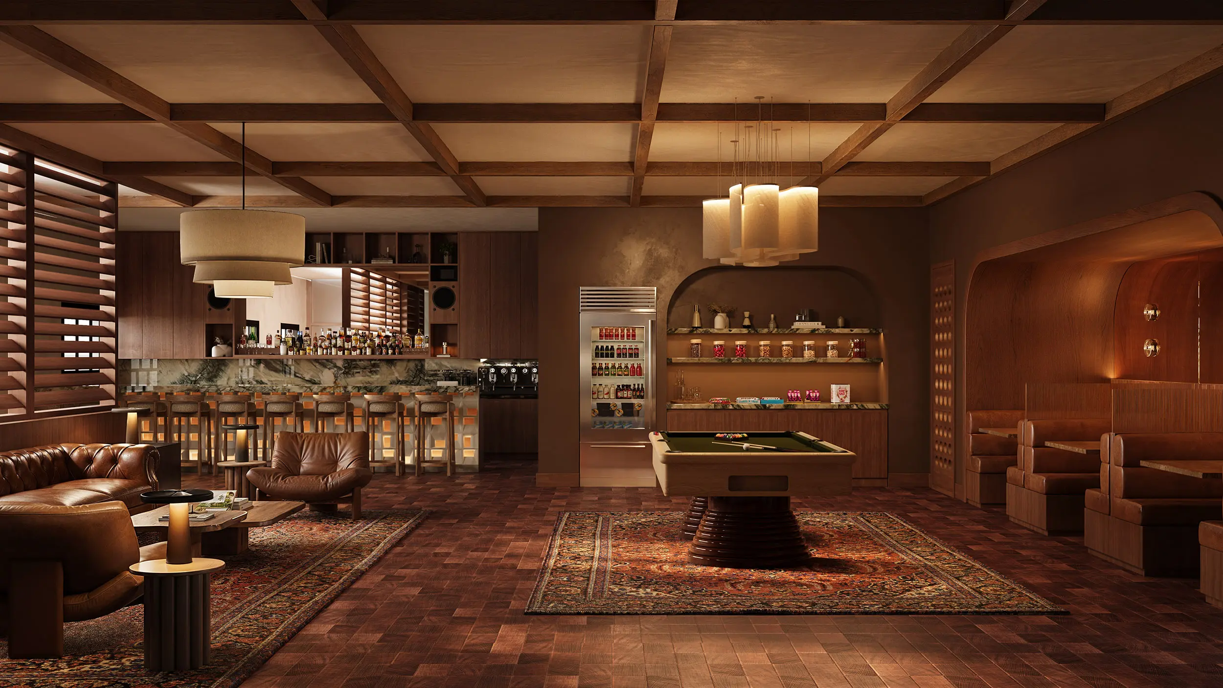 Restaurant and food-and-beverage 3D rendering covers fine-dining venues, casual restaurants, cafés, specialty bars, and dark-kitchen concepts. We focus on the elements that define hospitality atmosphere — lighting design, materials, textures, custom furniture, bar design, and staged scenes with diners. These renders are used by restaurant brands for investor decks, franchise sales, landlord negotiations, and early marketing — where the mood and experience of the space need to be sold long before the kitchen opens.